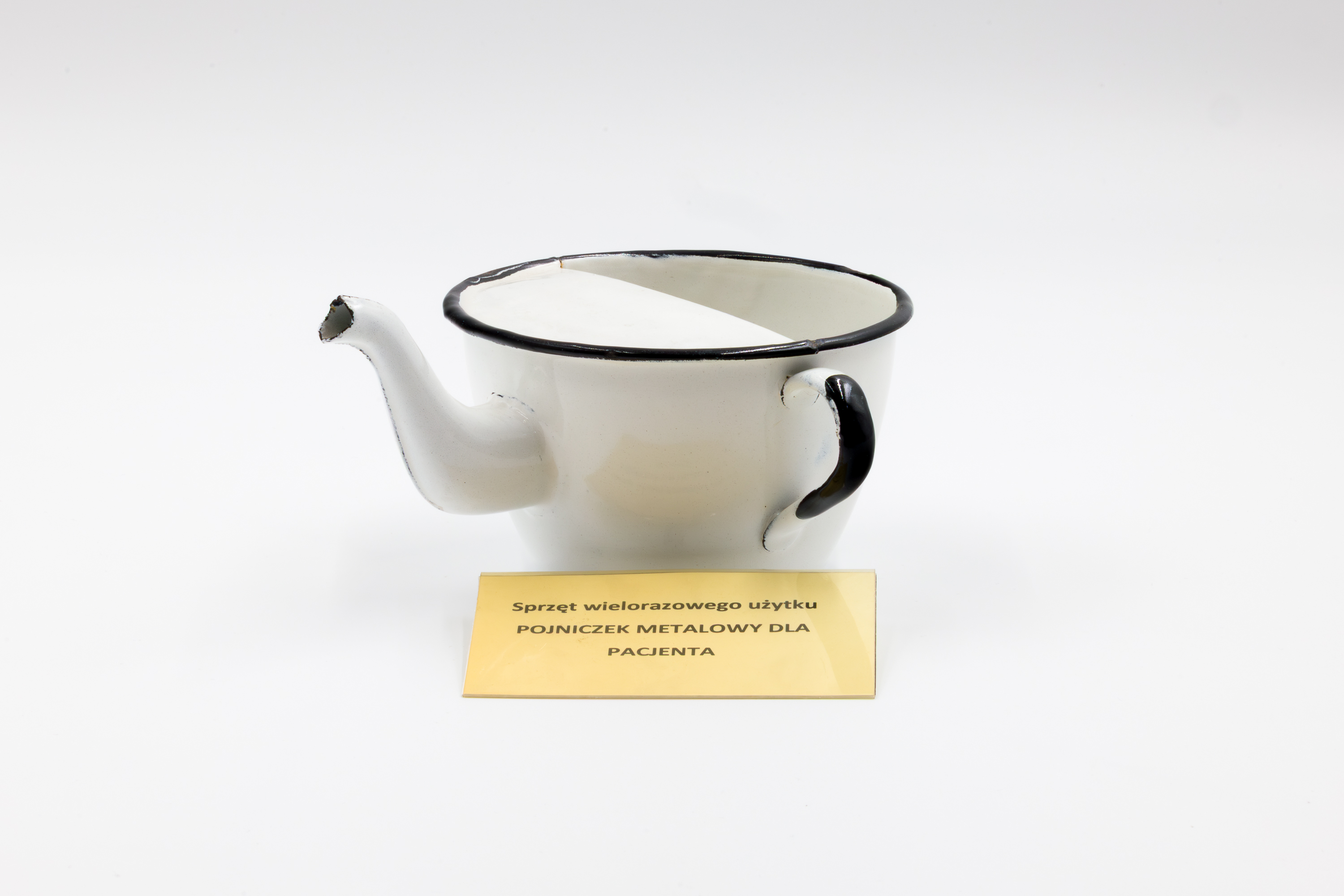 Opis: Sprzęt wielorazowego użytku, niegdyś powszechnie stosowany w polskich szpitalach i sanatoriach. Służył do podawania pacjentom wody, napojów, a także leków w płynie. Wykonany z metalu pokrytego emalią, był trwały, łatwy do dezynfekcji i odporny na wysoką temperaturę. Ze względu na charakterystyczne ucho umożliwiające pewny chwyt, pojnik był szczególnie przydatny w opiece nad osobami osłabionymi lub unieruchomionymi. Stanowi przykład praktycznego wyposażenia pielęgniarskiego z czasów, gdy w medycynie dominował sprzęt wielorazowego użytku, wymagający starannej sterylizacji i konserwacji.