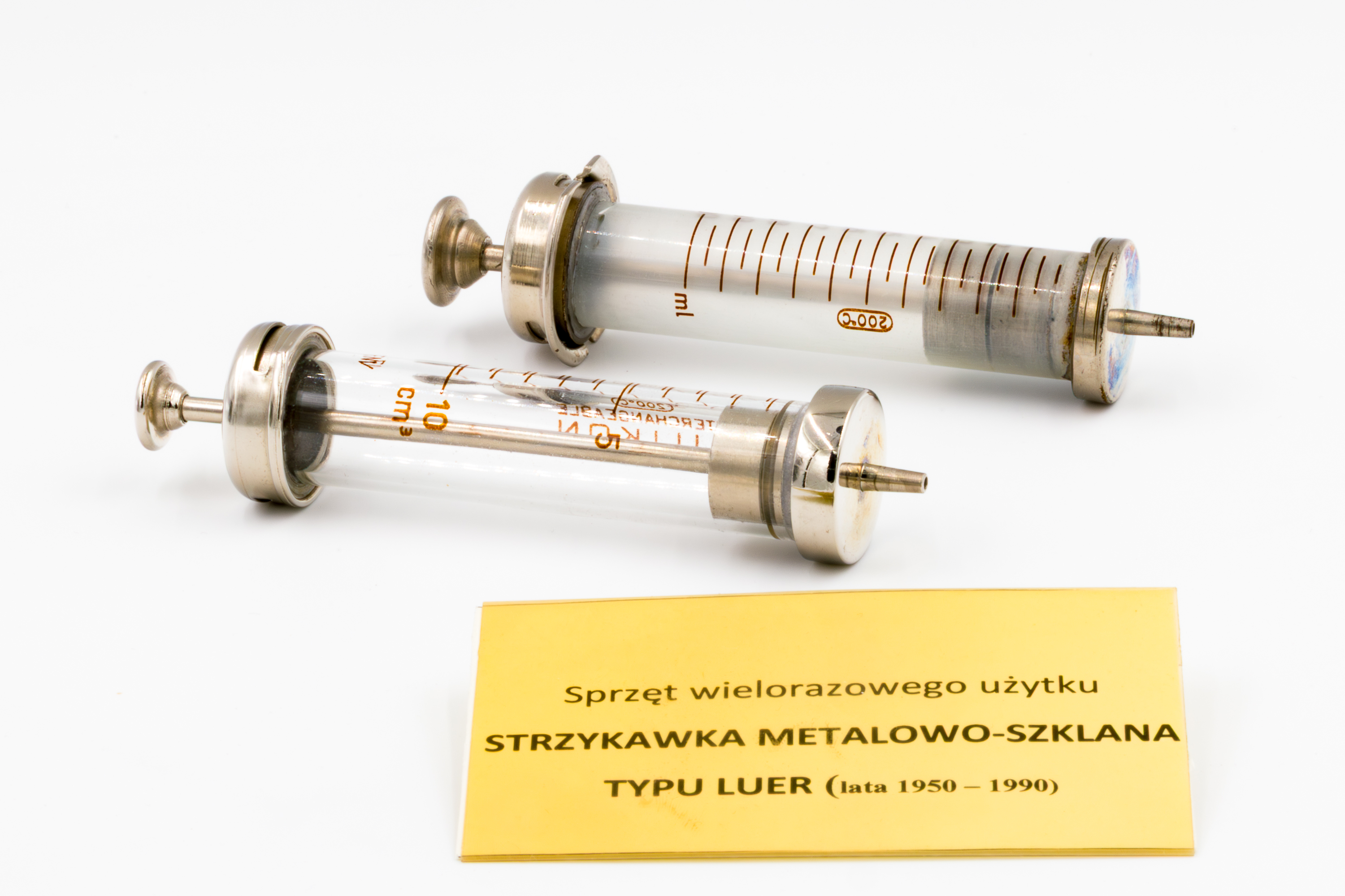 Opis: Strzykawka wielokrotnego użytku, wykonana z metalu i szkła, z końcówką typu Luer umożliwiającą szczelne i precyzyjne mocowanie igły. Tego rodzaju instrumenty medyczne stosowano powszechnie w drugiej połowie XX wieku, zanim zostały zastąpione jednorazowymi strzykawkami z tworzyw sztucznych.