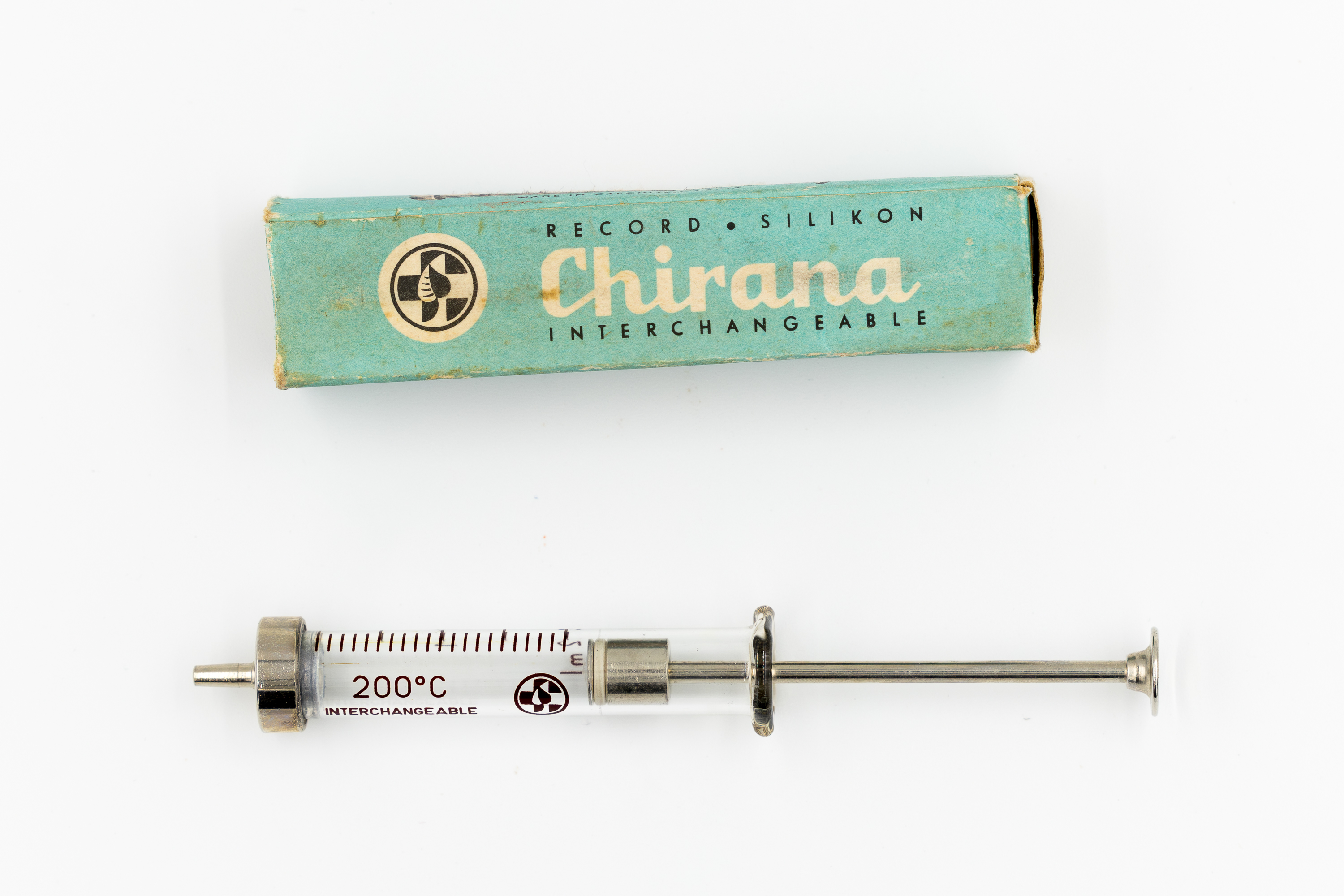 Opis: Strzykawka Record - wprowadzona prawdopodobnie w 1906 roku przez Dewitt & Herz (Berlin). Strzykawka typu Record to połączenie szkła i metalu: przezroczysta, precyzyjna lufa, metalowy tłok z charakterystycznym pierścieniem i na końcu – niestożkowa, cylindryczna końcówka kompatybilna tylko z przeznaczonymi dla niej, najczęściej metalowymi igłami tego typu. Na szklanym korpusie naniesione barwione precyzyjne podziałki oznaczenia objętości (często w 0,2 cm³), wraz ze skalą “CCM” i znakami symbolu medycznego. Była projektowana jako wielorazowe narzędzie medyczne: łatwa do dezynfekcji i demontażu, dokładna w pomiarach, używana od początku XX wieku aż do lat 50.–60. XX w., zastąpione przez plastikowe strzykawki Luer i jednorazowe modele.