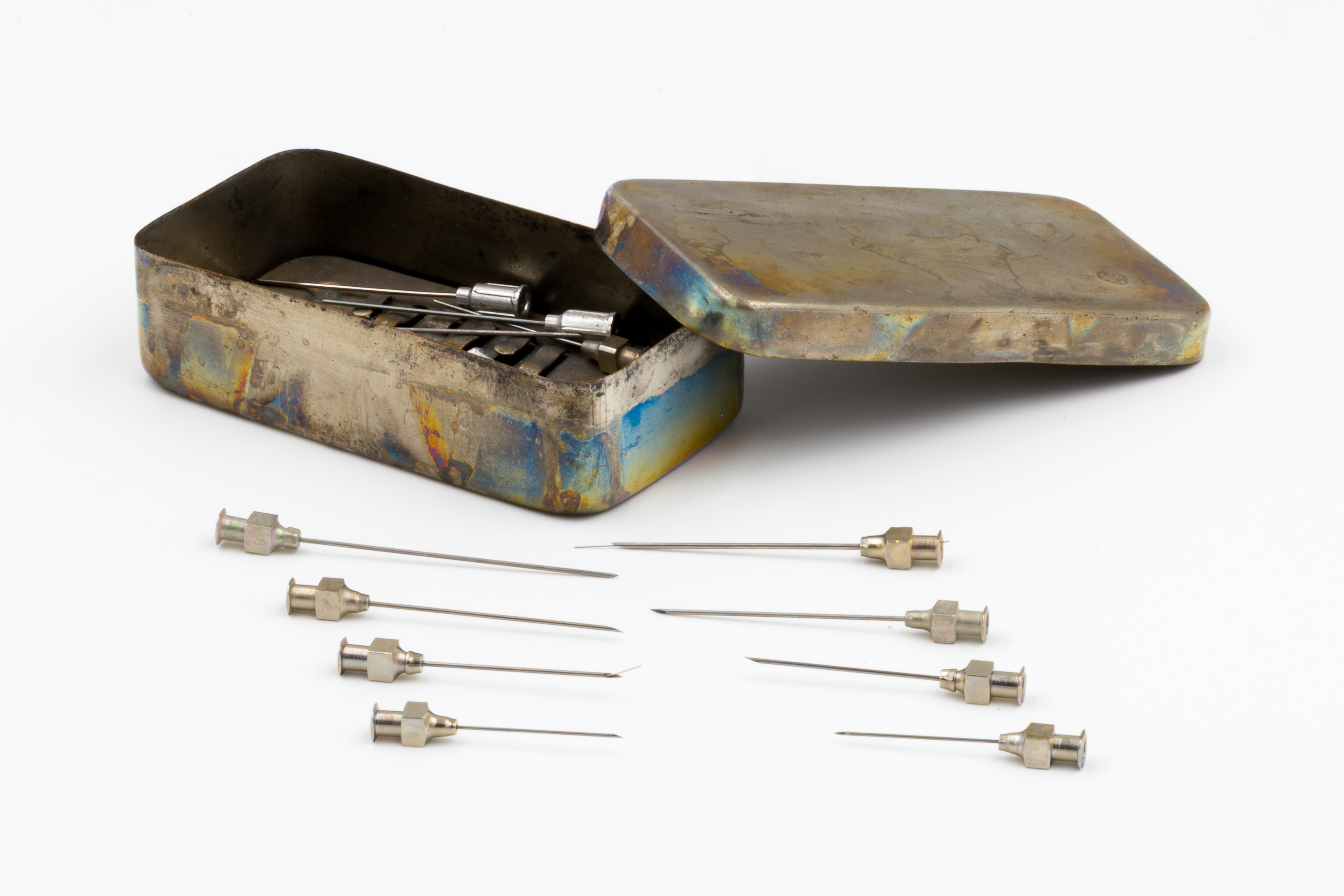 Opis: Igły do iniekcji wielokrotnego użytku z lat 70. XX w. były wykonane z metalu (stal nierdzewna) i posiadały stożkową końcówkę do przebijania skóry.