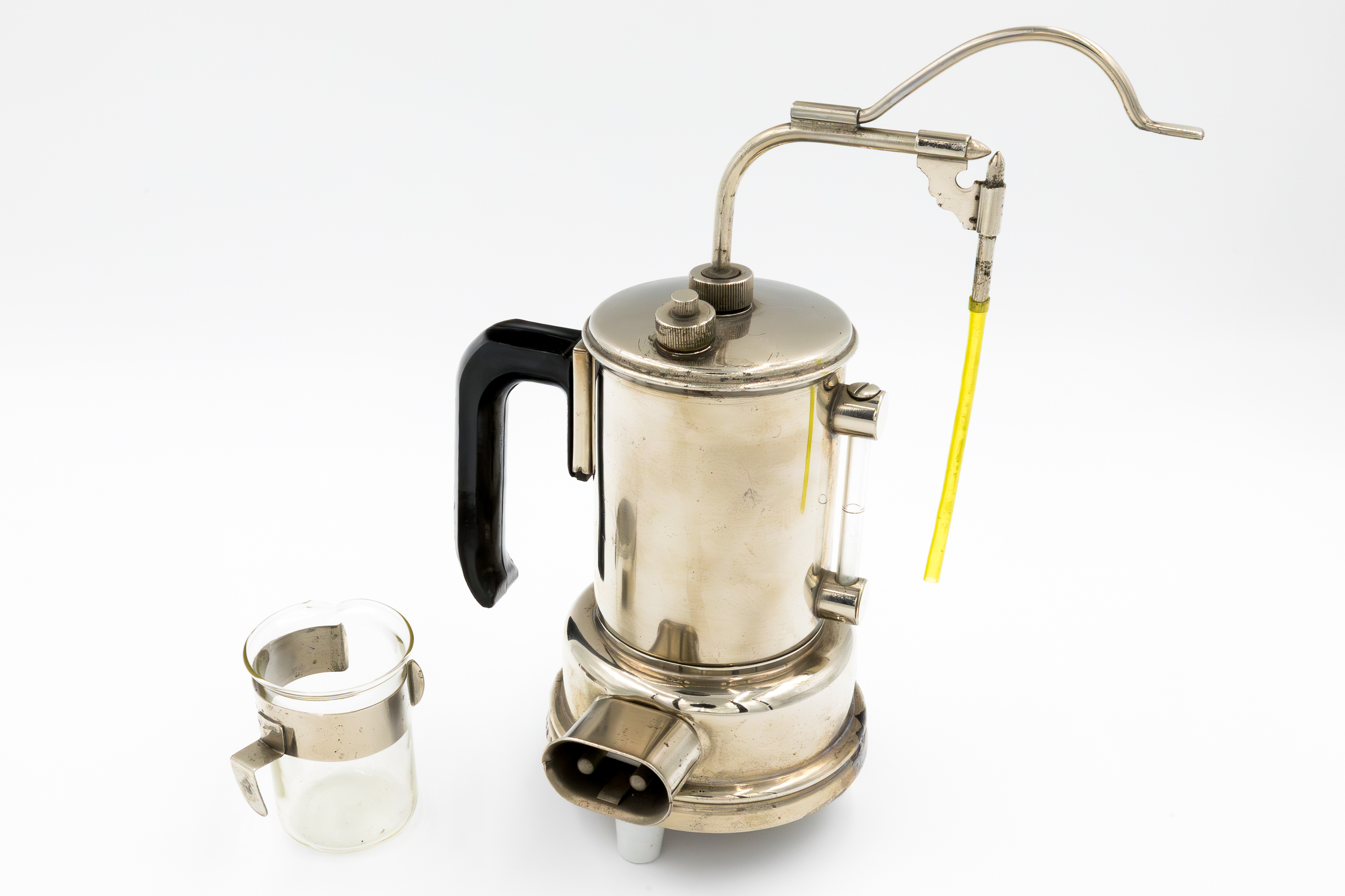 Opis fizyczny: W podstawie aparatu ulokowany jest element grzejny o mocy 250 W ze spiralą oraz bocznym gniazdem do przewodu elektrycznego. Urządzenie zasilane prądem o napięciu 220V. Z podstawą zespolony jest zbiornik na wodę wykonany z niklowanej stali, wyposażony w uchwyt i rurkę wskaźnikową. Zbiornik posiada wlew wody z zaworem bezpieczeństwa i rurkę do odprowadzania pary.