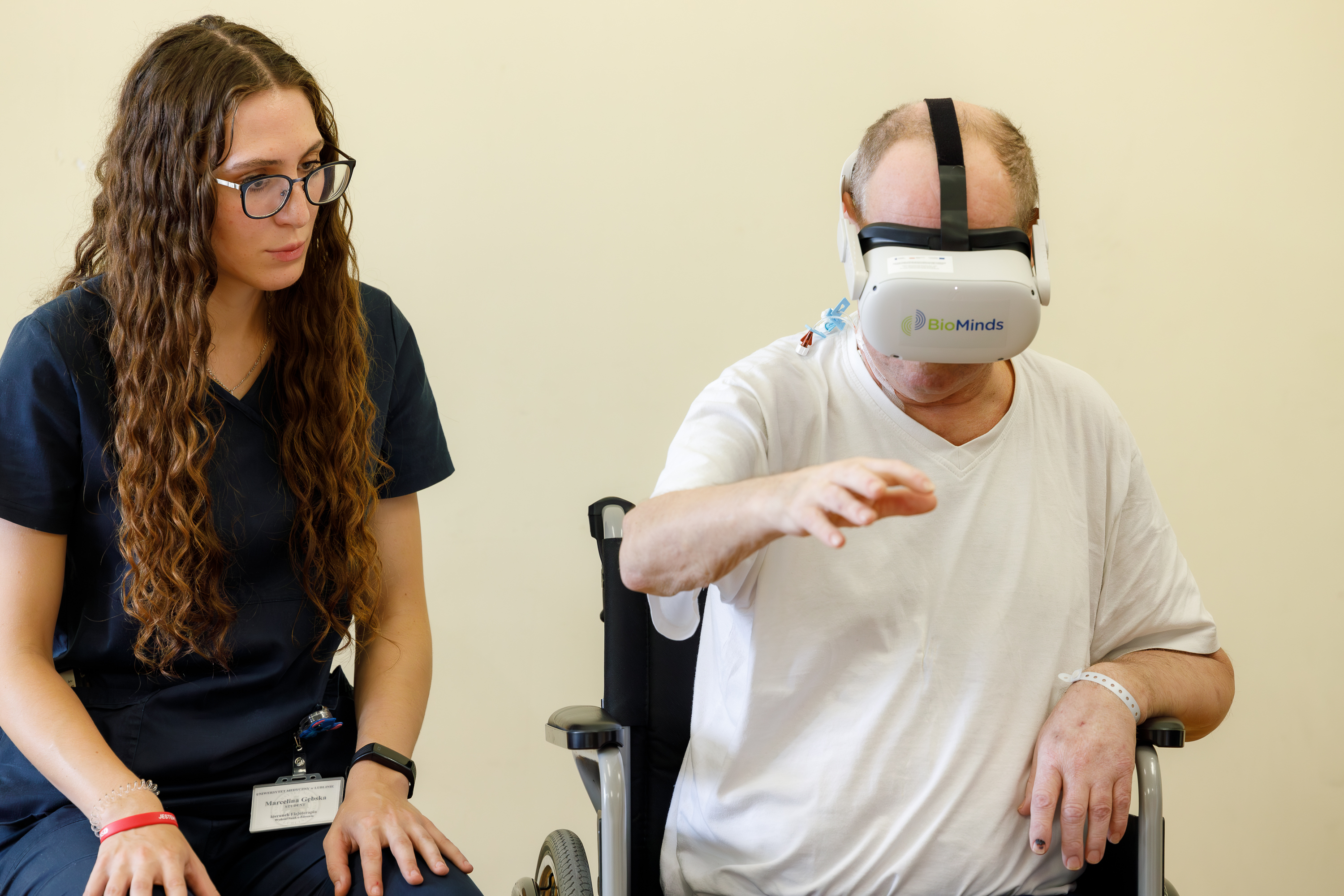 Opis fizyczny: Pacjenci Uniwersyteckiego Szpitala Klinicznego Nr 4 w Lublinie ze schorzeniami neurologicznymi korzystają z procedury terapeutycznej wykorzystującej wirtualną rzeczywistość. To efekt współpracy Klinicznego Oddziału Rehabilitacji USK Nr 4 w Lublinie ze startupem BioMinds Healthcare Sp. z o.o. Podczas treningu rehabilitowani pacjenci wychodzą poza salę gimnastyczną do wirtualnej rzeczywistości – na łąkę, do domu z ogrodem czy w kosmos. Ćwiczą, wykonując w tych przestrzeniach różne czynności. Jest to możliwe dzięki wykorzystaniu zaawansowanych zestawów, w tym gogli VR, kontrolerów ruchu oraz sensorów śledzących ruch. Czynności, które wykonują pacjenci, urozmaicają standardowy, oparty na jednostajnie powtarzanych ćwiczeniach fizycznych program zajęć rehabilitacyjnych o elementy przypominające grę komputerową, co dodatkowo motywuje i poprawia nastrój rehabilitowanych. Fizjoterapeuci mają możliwość monitorowania ich postępów w czasie rzeczywistym i dostosowywania trudności ćwiczeń w zależności od wyników.