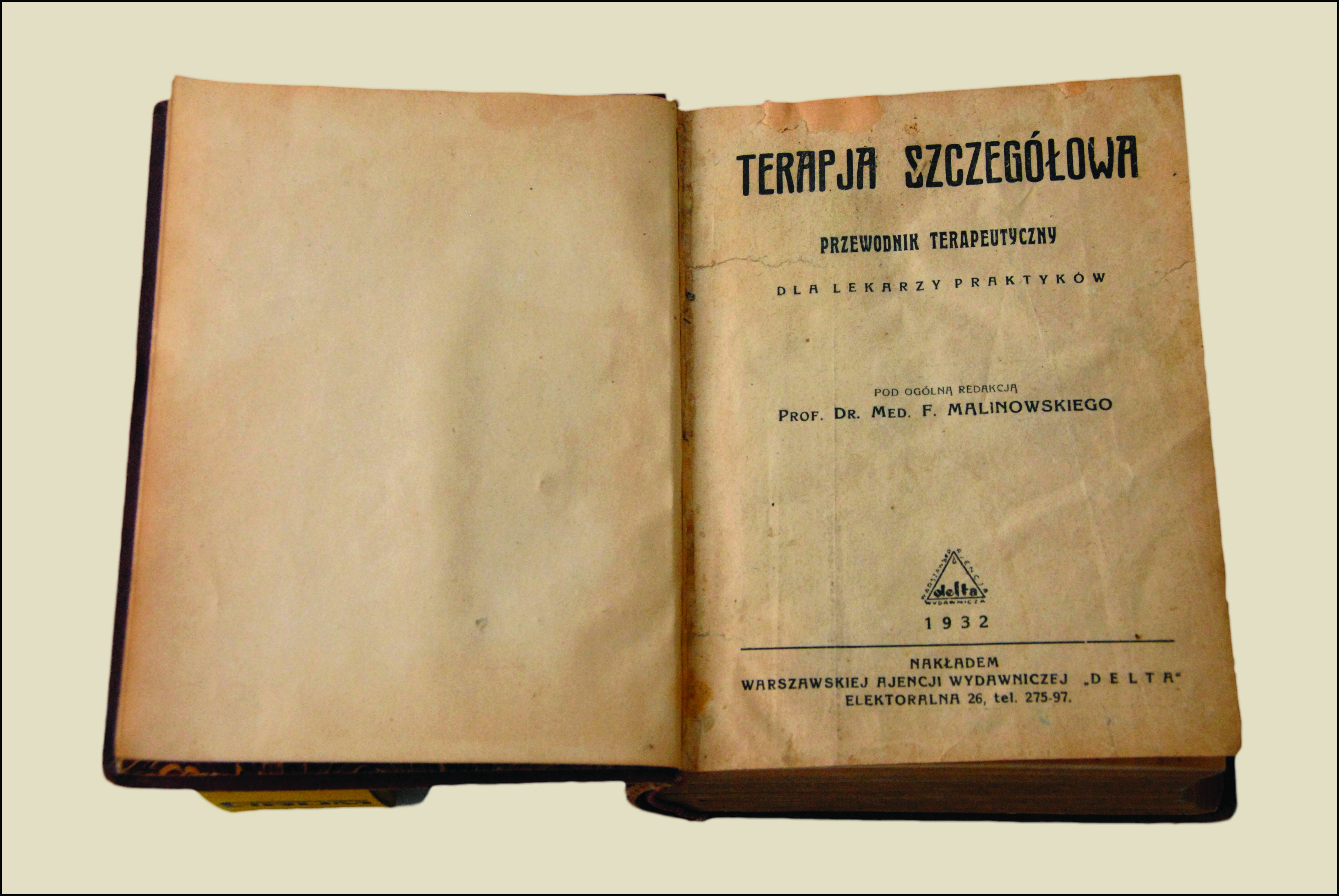 Opis: Przedstawiony eksponat to podręcznik medyczny zredagowany przez znanego polskiego lekarza, profesora Feliksa Władysława Malinowskiego (1871-1947) i wydany przez Warszawską Ajencję Wydawniczą "Delta". Publikacja ta służyła jako kompleksowy przewodnik, zawierający szczegółowe opisy terapii różnych schorzeń, od chorób zakaźnych, przez dolegliwości wewnętrzne, aż po schorzenia neurologiczne i chirurgiczne.