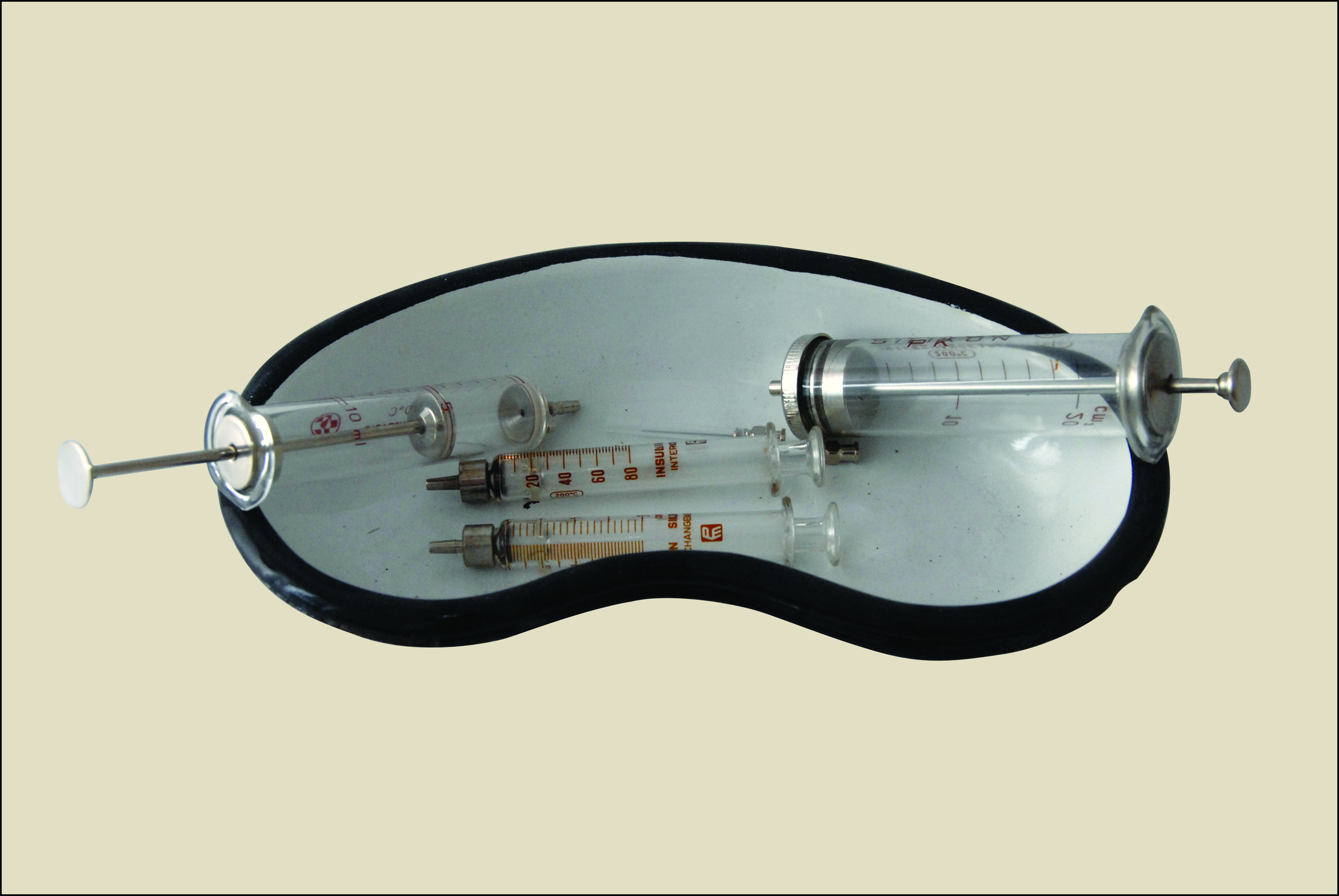 Miska nerkowata i szklane strzykawki wielorazowego użytku, producent nieznany (lata 60. XX w.)
