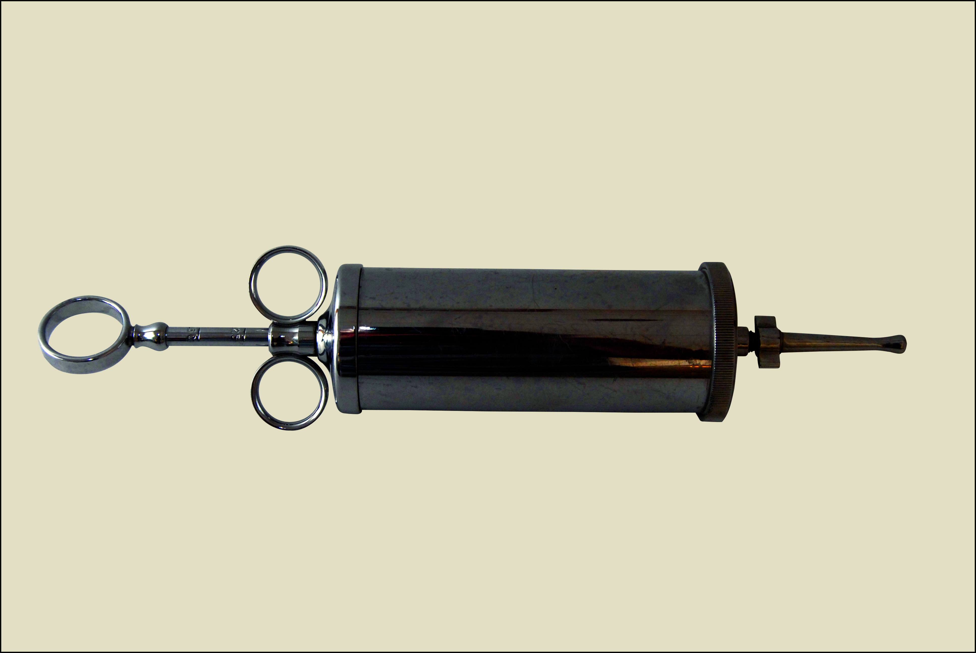 Opis: Strzykawka irygacyjna z lat 70. XX wieku przeznaczona do przepłukiwania jam ciała oraz ran w warunkach szpitalnych i ambulatoryjnych.