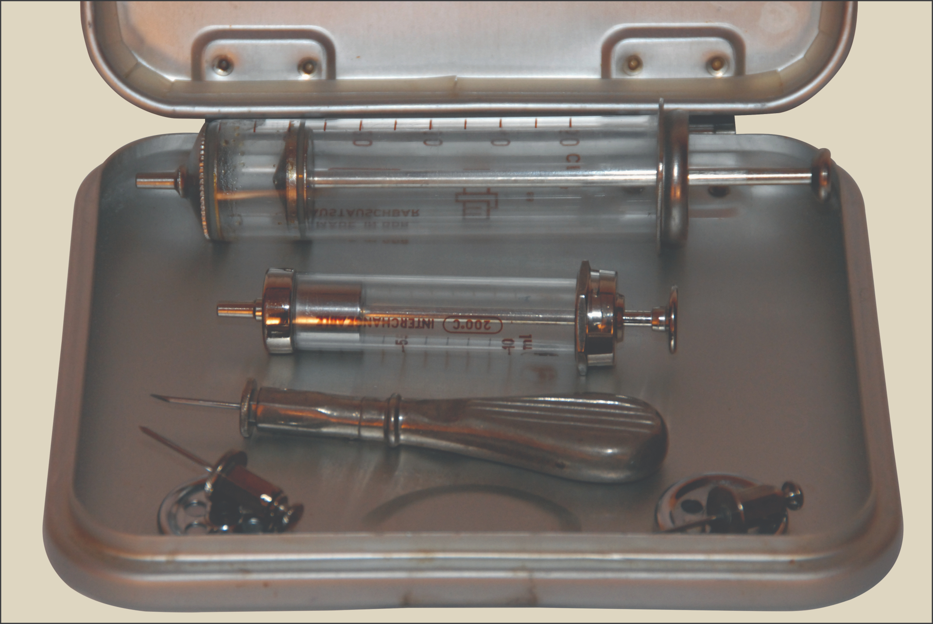Opis: Zestaw przeznaczony do leczenia odmy opłucnowej, stosowany w medycynie lat 40. XX wieku, kiedy techniki torakochirurgiczne i narzędzia do drenażu klatki piersiowej dopiero się standaryzowały. Umożliwiał odprowadzenie nagromadzonego powietrza z jamy opłucnej, co pozwalało przywrócić prawidłowe rozprężenie płuca i ustabilizować stan pacjenta.