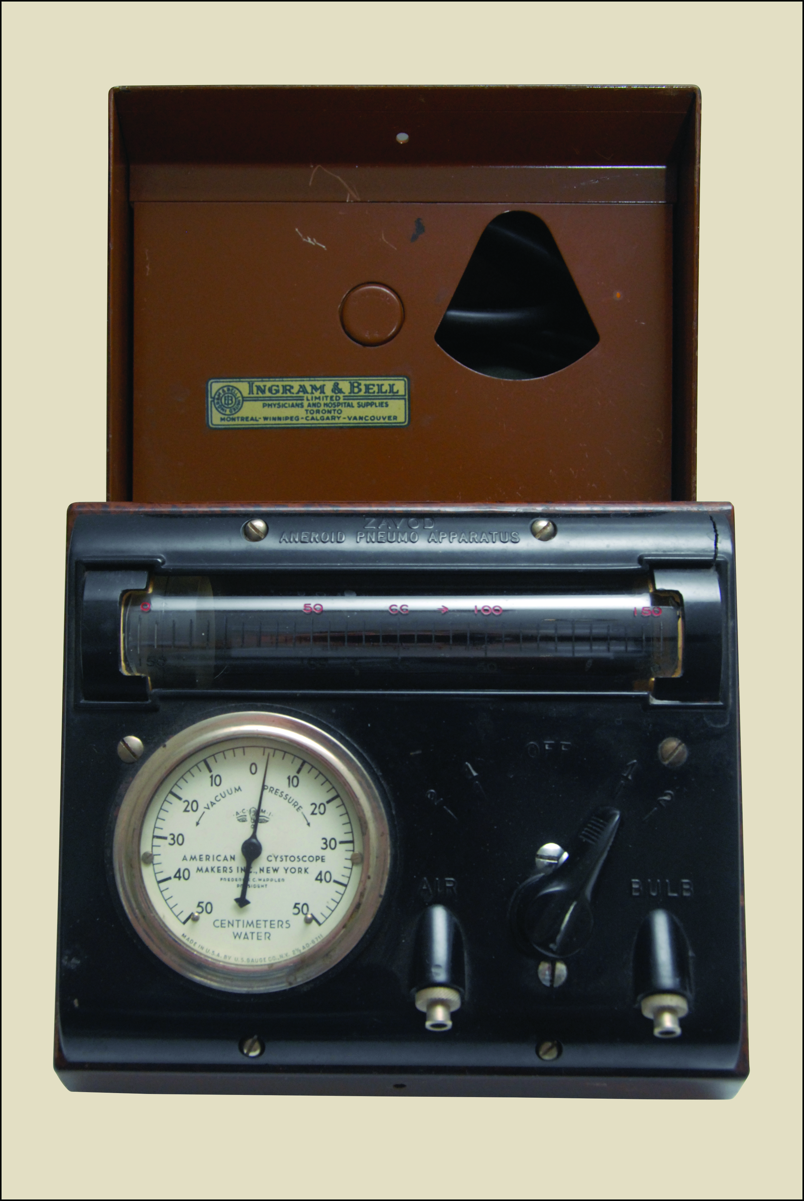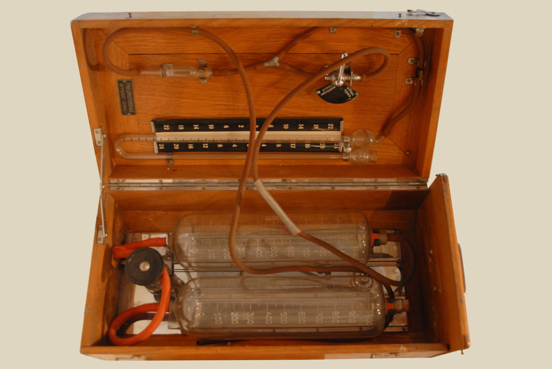Opis: Aparat ten służył do wytwarzania odmy opłucnowej – zabiegu polegającego na wprowadzeniu powietrza do jamy opłucnej w celu zapadnięcia chorego płuca. Procedura ta była powszechnie stosowana w pierwszej połowie XX wieku jako jedna z metod leczenia gruźlicy płuc, zanim pojawiły się skuteczne leki przeciwprątkowe.