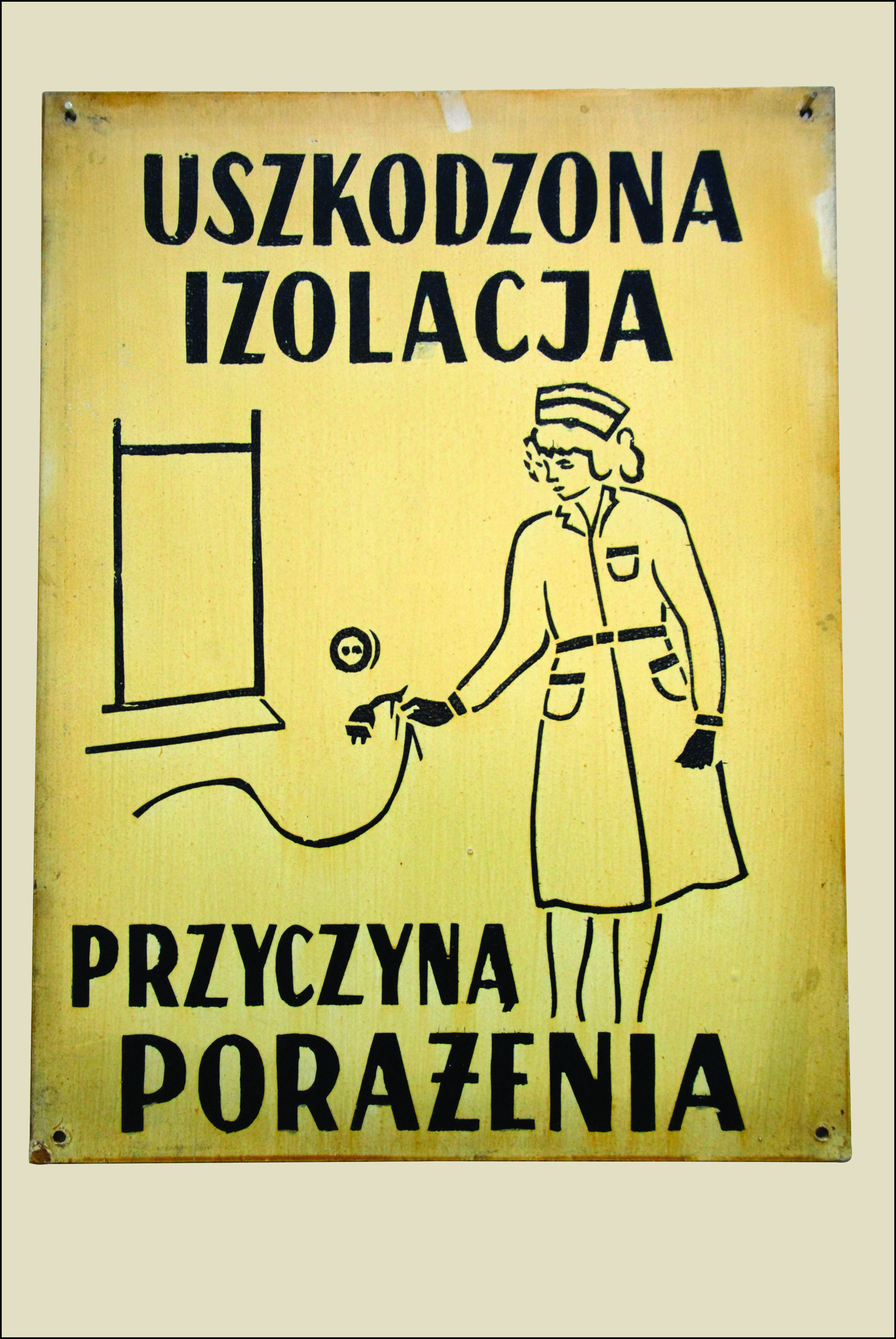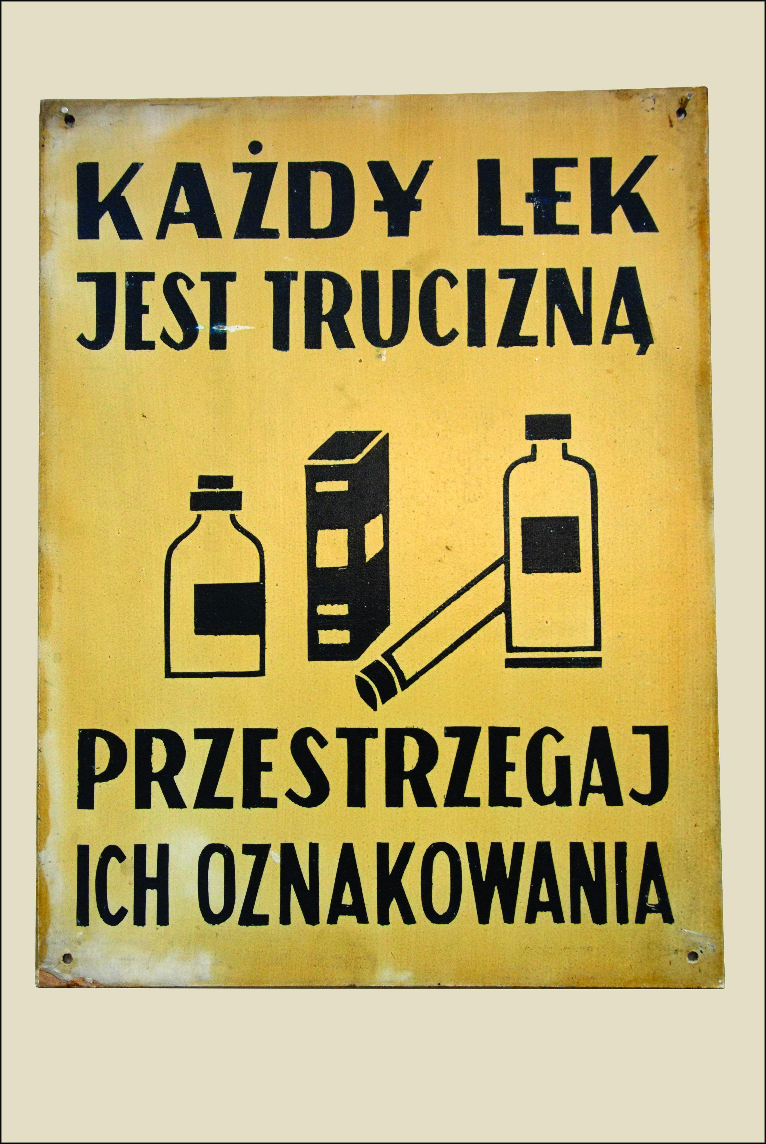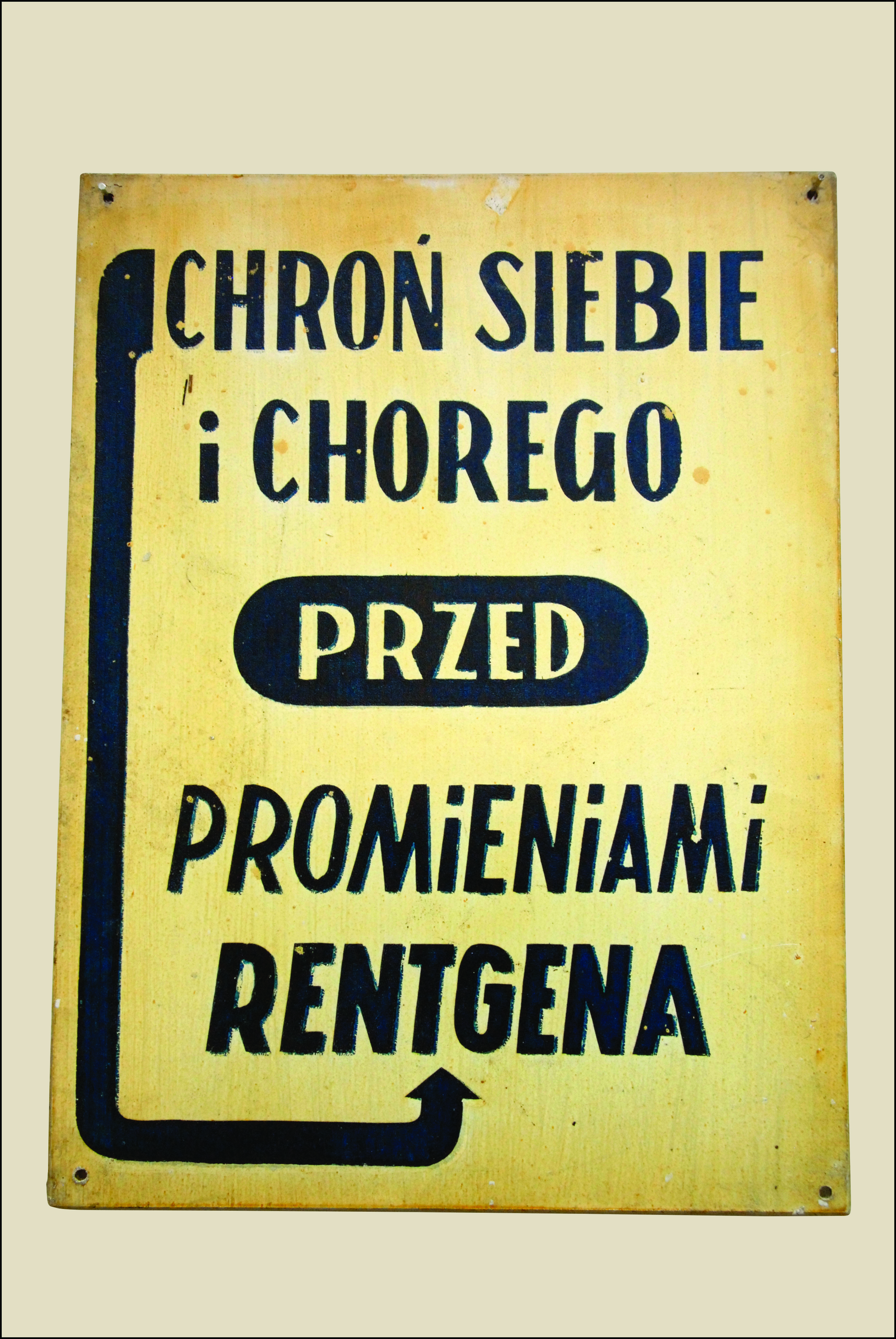Opis: Tablice BHP stanowią przykład wizualnej kultury bezpieczeństwa funkcjonującej w polskich szpitalach w latach 60. XX wieku. Były to trwałe, najczęściej metalowe lub emaliowane plansze o wyrazistej typografii i prostych, łatwo rozpoznawalnych piktogramach. Ich celem było przekazywanie jasnych, zwięzłych komunikatów dotyczących zasad higieny, bezpieczeństwa pracy oraz właściwego korzystania z infrastruktury medycznej.