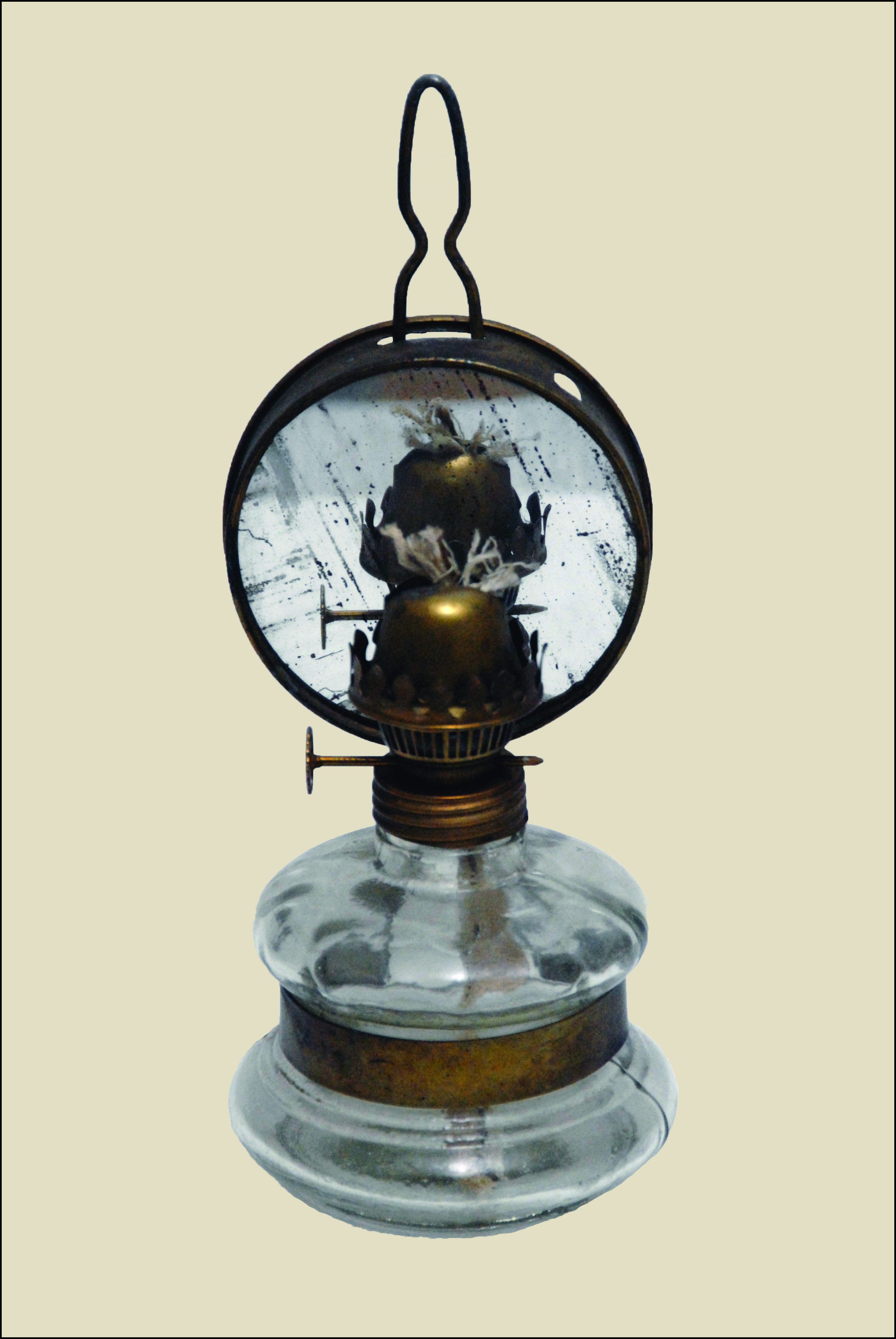 Opis: Przenośna lampa naftowa składająca się z profilowanego, szklanego zbiornika na paliwo oraz mosiężnego palnika. Cechą charakterystyczną obiektu jest zamontowany za palnikiem okrągły, wklęsły odbłyśnik (lustro), którego zadaniem było skupianie i kierunkowanie strumienia światła, co zwiększało efektywność oświetlenia w konkretnym punkcie. Lampa wyposażona jest w druciany uchwyt ułatwiający przenoszenie lub zawieszenie na ścianie. Tego typu lampy były wykorzystywane przez personel pielęgniarski i lekarski jako mobilne źródło światła podczas nocnych obchodów oddziałów, ułatwiając doglądanie pacjentów bez konieczności zapalania głównego oświetlenia sali. Służyły również jako oświetlenie awaryjne w przypadku przerw w dostawie energii elektrycznej, zapewniając niezbędną widoczność do wykonywania podstawowych czynności medycznych.