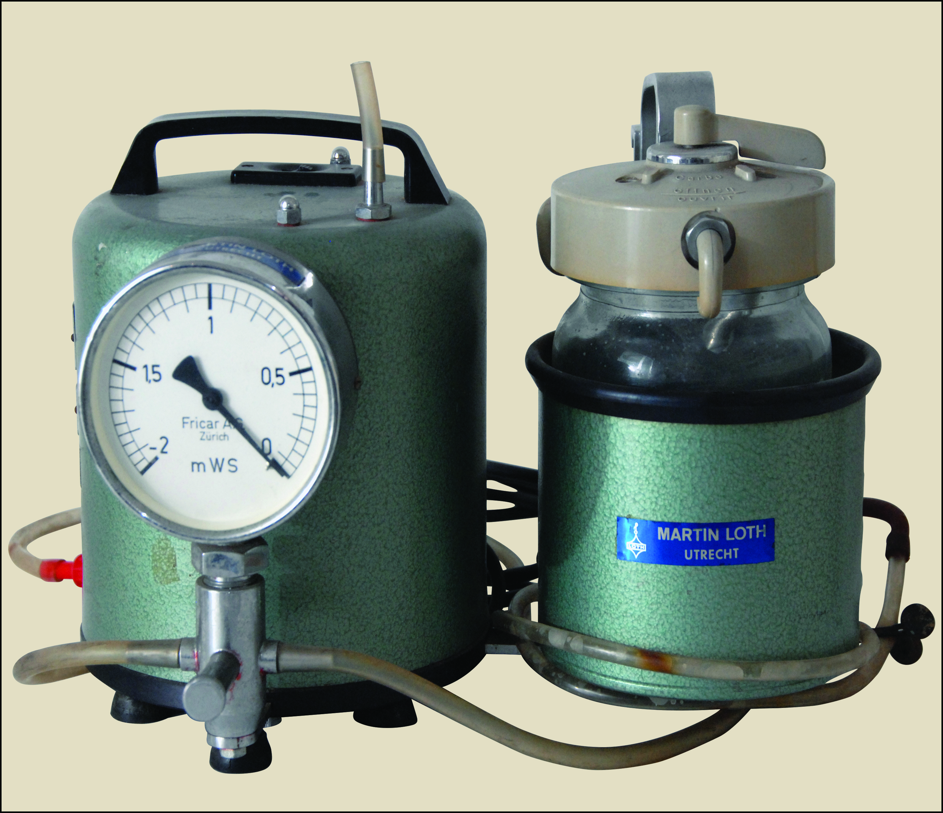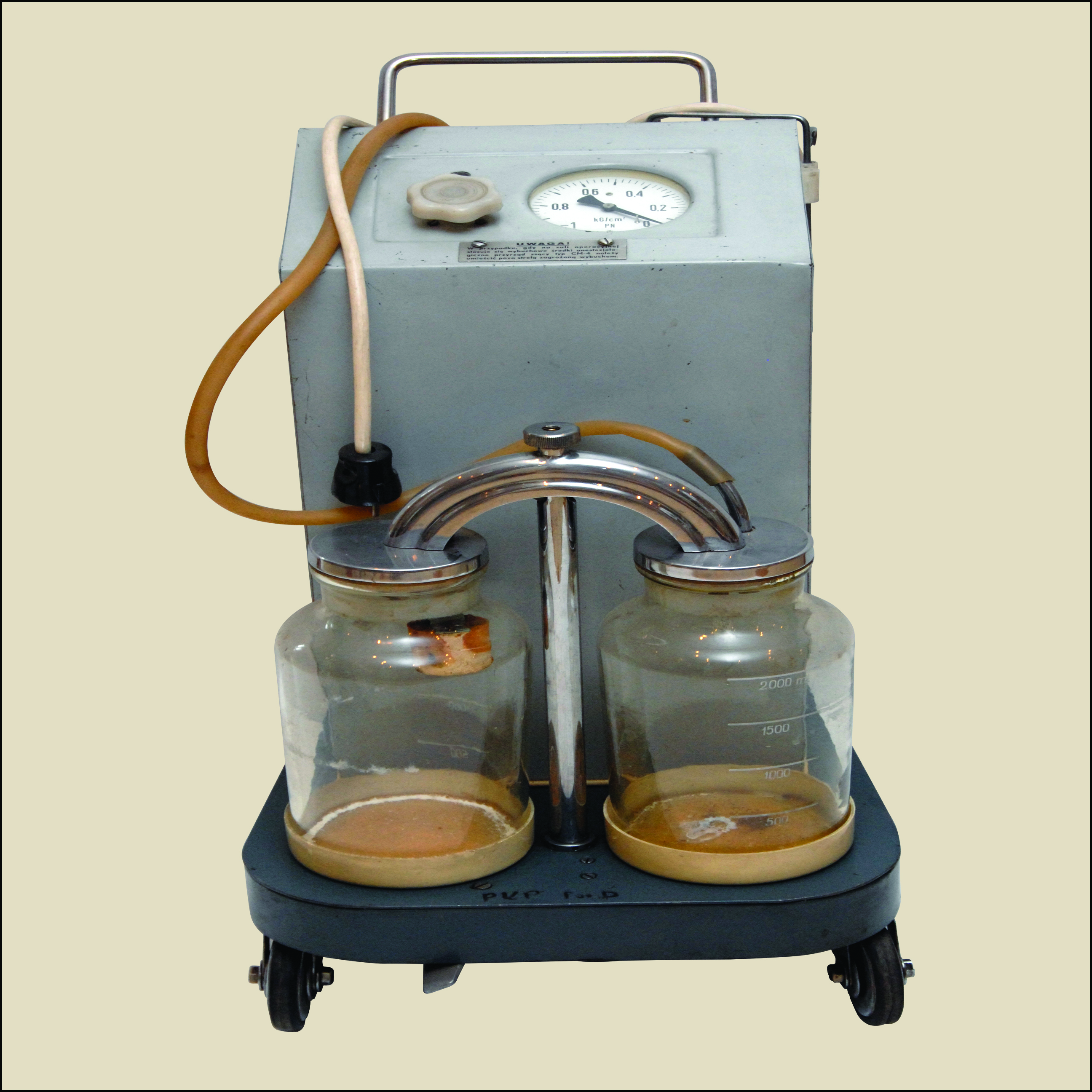 Opis: Szpitalne urządzenie elektryczne służące do odsysania płynów z dróg oddechowych lub ran operacyjnych. Składa się z metalowej pompy wytwarzającej podciśnienie i dwóch dużych szklanych zbiorników do gromadzenia odessanych wydzielin. Wyposażony w manometr do kontroli siły ssania i system gumowych rurek.