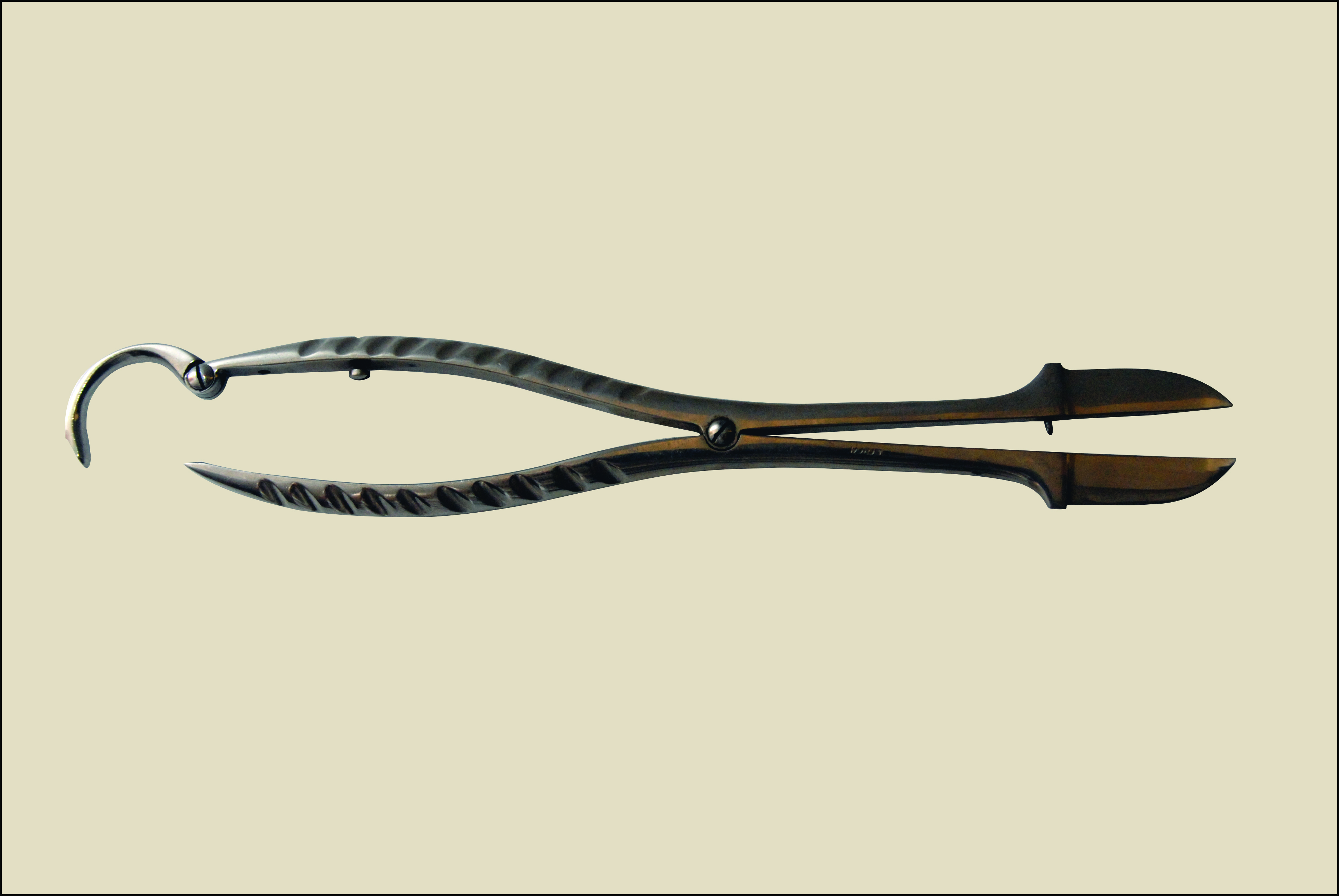 Opis: Prezentowane nożyce to przykład specjalistycznego narzędzia, którego zadaniem było usuwanie opatrunków gipsowych. Szczególną uwagę zwracają ostrza: jedno z nich jest ostre i lekko zakrzywione, podczas gdy drugie zakończone jest charakterystycznym haczykiem. Takie połączenie umożliwiało pewne zahaczenie i podważenie gipsu, a następnie jego efektywne przecięcie, minimalizując ryzyko urazu pacjenta. Długie rękojeści zapewniały operatorowi odpowiednią dźwignię i kontrolę nad narzędziem.