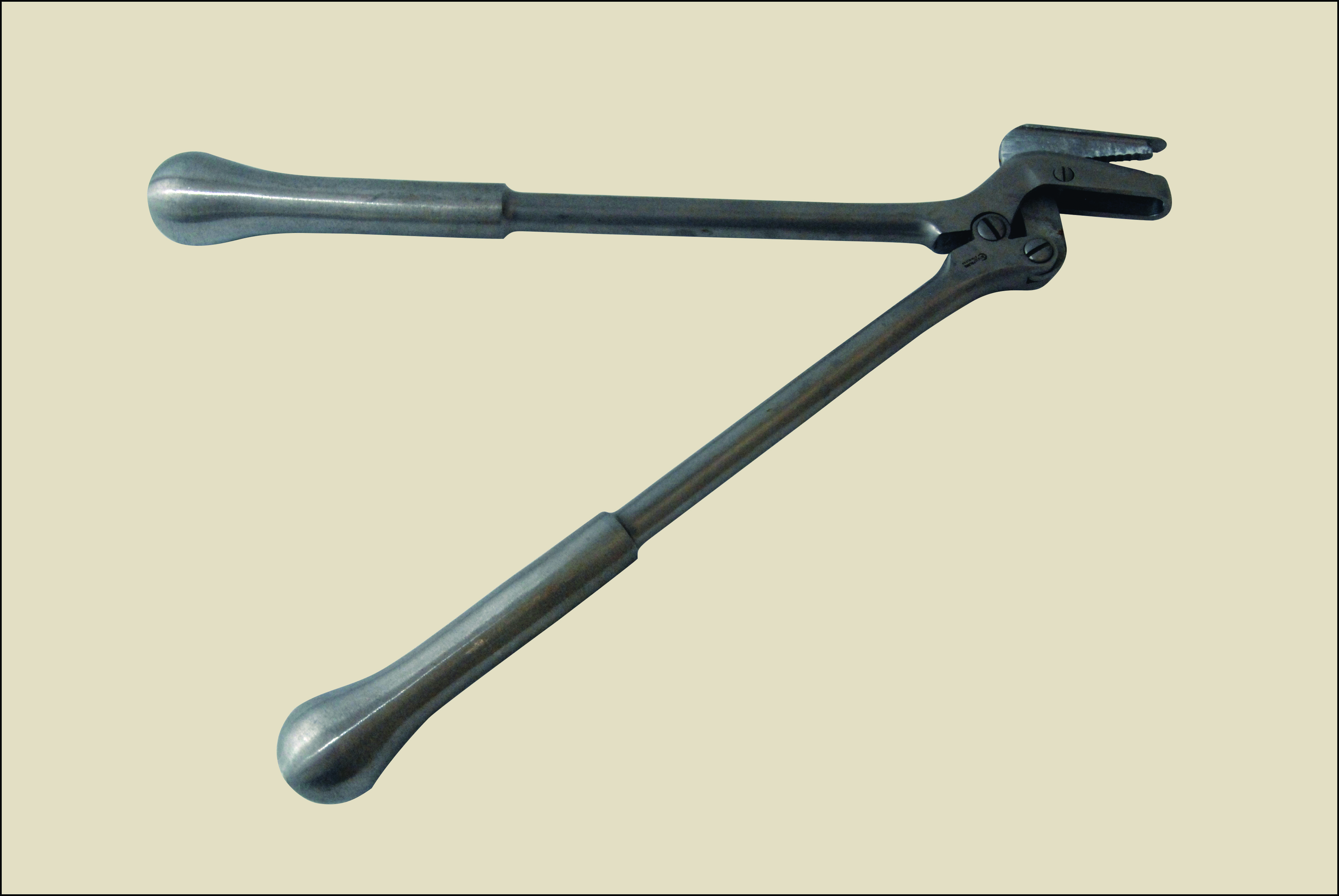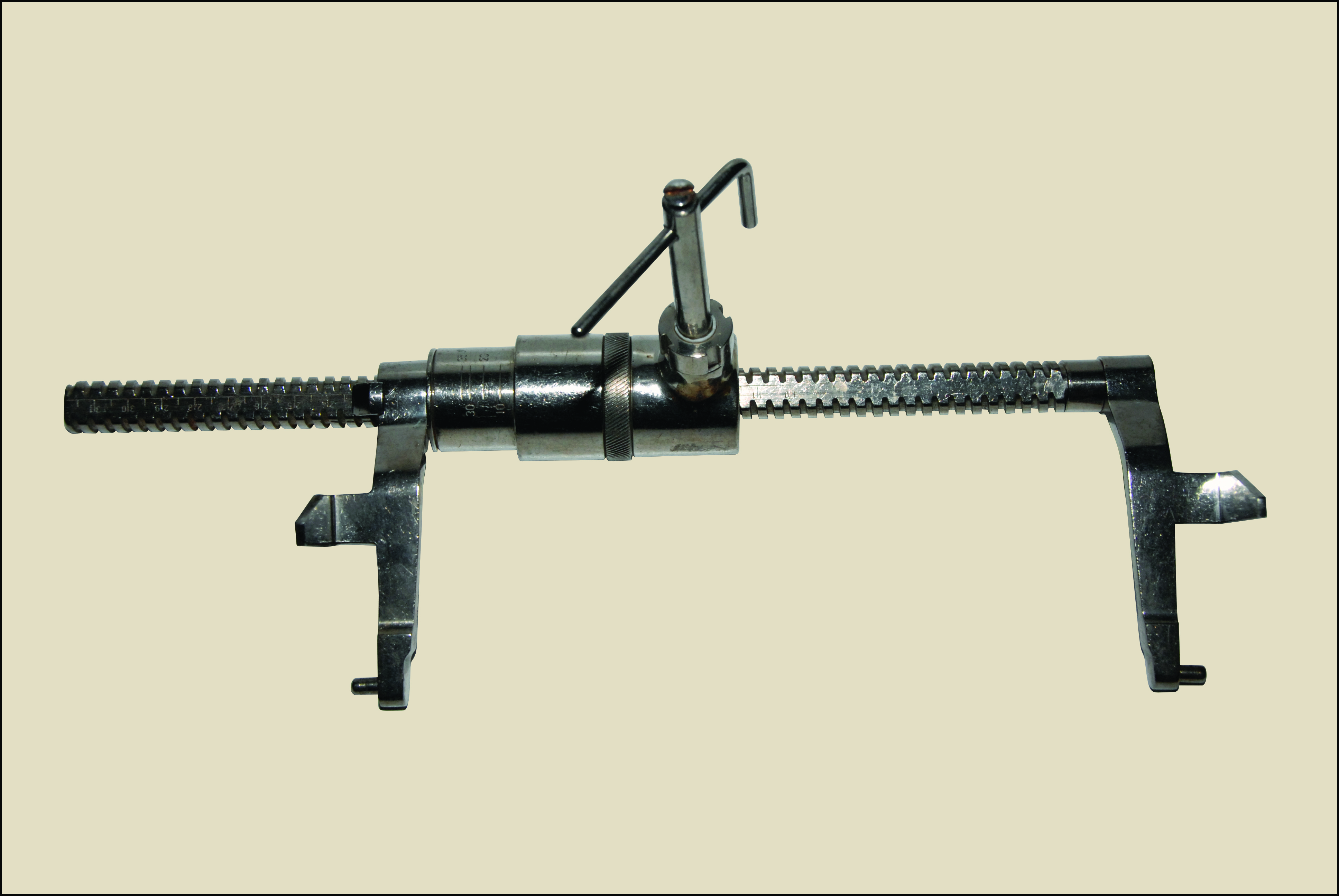 Opis: Prezentowany instrument to dystraktor kręgosłupa – specjalistyczne narzędzie wykorzystywane w chirurgii do precyzyjnego rozciągania (dystrakcji) segmentów kręgosłupa. Dystraktory takie były kluczowe w leczeniu schorzeń takich jak skoliozy, kifozy czy urazy kręgosłupa, gdzie konieczne było odciążenie lub korekcja krzywizn. Centralny, walcowaty element pełni rolę mechanizmu regulacyjnego, wyposażonego w śrubę lub przekładnię, którą manipulowano za pomocą wystającego, zakrzywionego uchwytu. Pozwalało to na precyzyjne odmierzenie i utrzymanie żądanej odległości między kręgami. Na końcach prętów znajdują się solidne, haczykowate ramiona, które były mocowane do struktur kostnych kręgosłupa lub do specjalnych implantów.