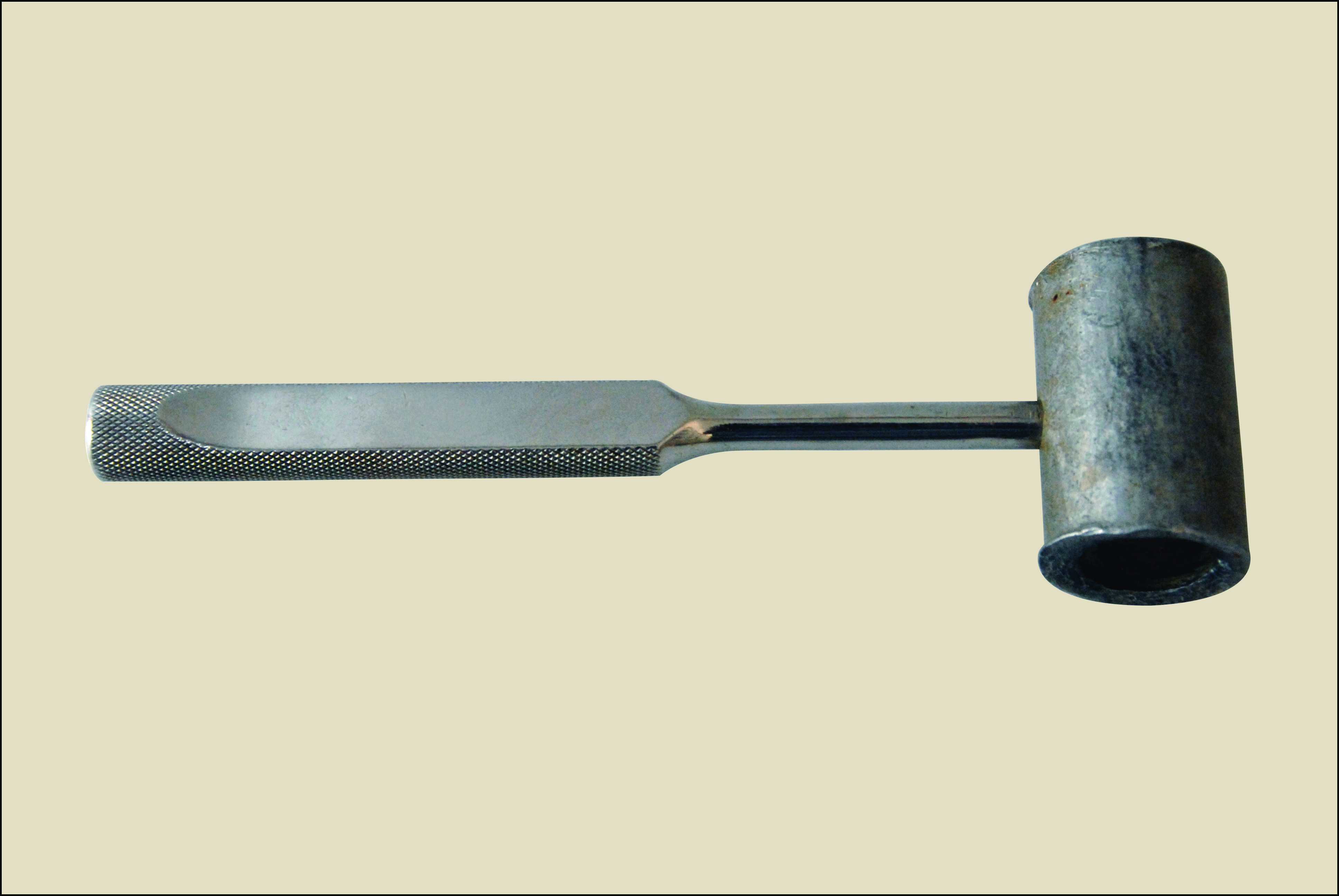 Opis: Prezentowany młotek jest specjalistycznym narzędziem wykorzystywanym w ortopedii w połączeniu z innymi instrumentami, takimi jak dłuta czy osteotomy, używanymi do kształtowania kości. Młotek ten, choć prosty w formie, był kluczowym narzędziem lekarza, umożliwiającym delikatne manipulacje kostne w trakcie zabiegów.