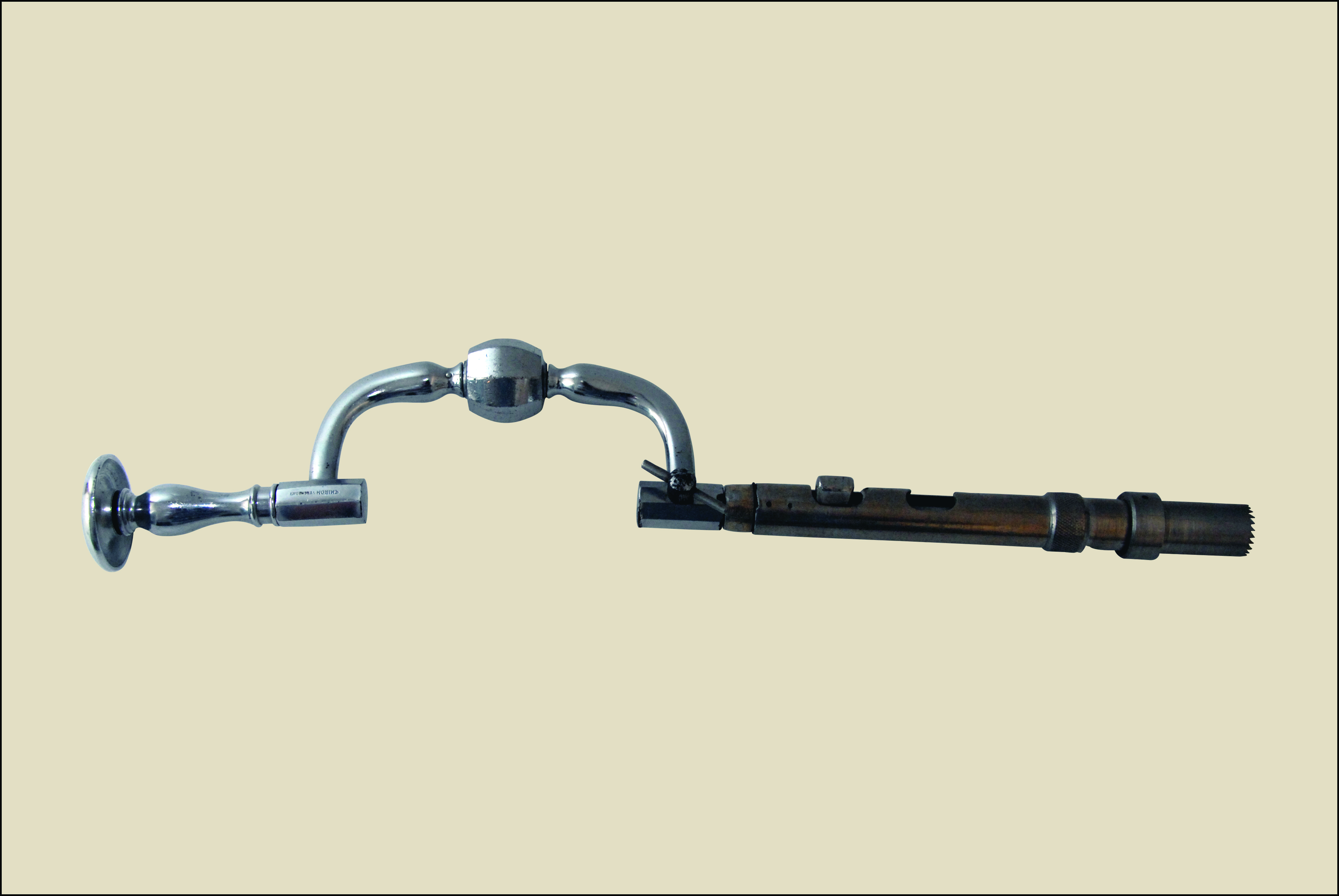 Opis: Prezentowane narzędzie to ręczna wiertarka do kości, kluczowy instrument wykorzystywany w chirurgii ortopedycznej przed erą napędu elektrycznego. Lewa część to korba z uchwytem, zaprojektowanym tak, aby zapewnić pewny i ergonomiczny chwyt podczas ręcznego obracania. Prawa część to trzonek wiertarki, do którego mocowano wymienne wiertła. Widoczne na nim ryflowania oraz gwint na końcu służyły do stabilnego mocowania wierteł o różnej średnicy, w zależności od potrzeb zabiegu. Ten typ wiertarki wymagał od chirurga dużej precyzji i siły, a jednocześnie pozwalał na wyczucie oporu tkanki kostnej, co było kluczowe dla bezpieczeństwa pacjenta.