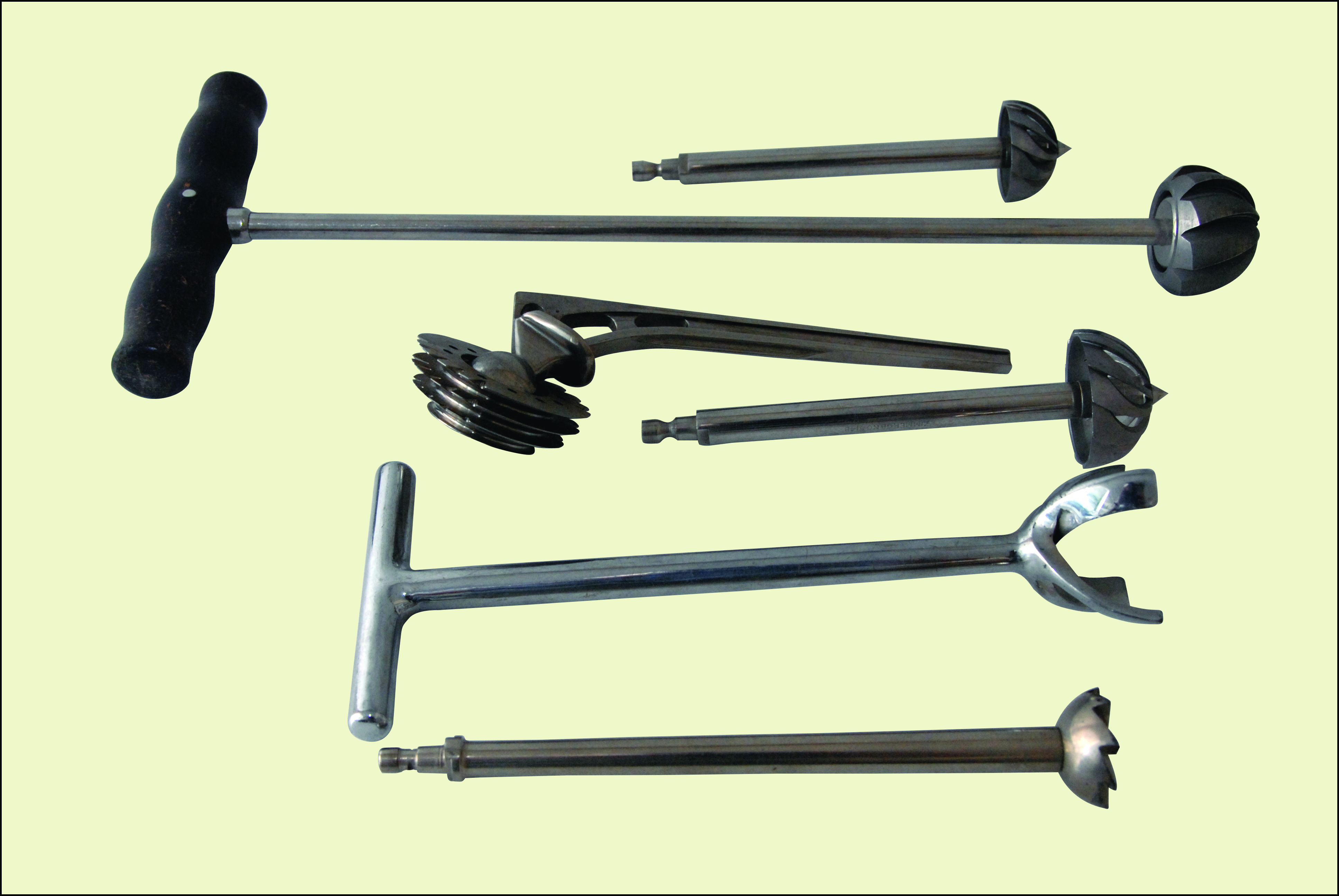 Opis: Prezentowany zestaw narzędzi chirurgicznych pochodzi z drugiej połowy XX wieku i przeznaczony jest do wykonywania operacji wszczepienia protezy stawu biodrowego metodą bezcementową. Narzędzia te były wykorzystywane przez ortopedów do precyzyjnego przygotowania panewki oraz trzpienia kości udowej pod implant. Metoda bezcementowa polega na zakotwiczeniu protezy w kości dzięki jej specjalnej, porowatej powierzchni, która umożliwia wrastanie tkanki kostnej i stabilizację implantu bez potrzeby użycia cementu.